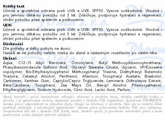 Účinná a spolehlivá ochrana proti UVA a UVB: SPF50. Vysoce voděodolné. Vhodné i pro jemnou dětskou pokožku od 3 let. Zvláčňuje, podporuje hydrataci a regeneraci, chrání pokožku před spálením a poškozením.