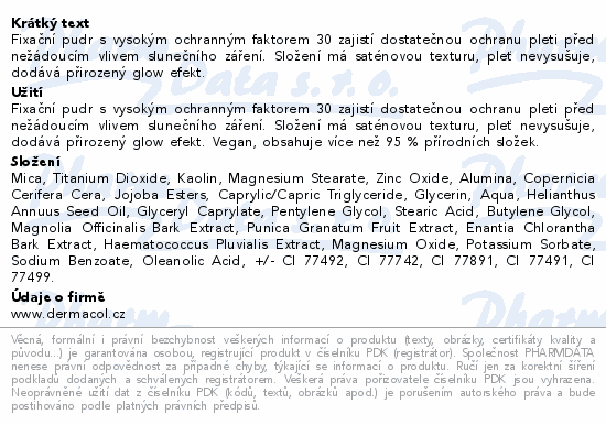 Fixační pudr s vysokým ochranným faktorem 30 zajistí dostatečnou ochranu pleti před nežádoucím vlivem slunečního záření. Složení má saténovou texturu, pleť nevysušuje, dodává přirozený glow efekt.