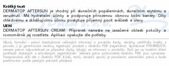 DERMATOP AFTERSUN je vhodný při slunečních popáleninách, slunečním erytému a zarudnutí. Má hydratační účinky a podporuje přirozenou obnovu kožní bariéry. Díky chladivému a zklidňujícímu účinku poskytuje příjemný pocit svěžesti a úlevy.