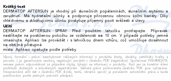 DERMATOP AFTERSUN je vhodný při slunečních popáleninách, slunečním erytému a zarudnutí. Má hydratační účinky a podporuje přirozenou obnovu kožní bariéry. Díky chladivému a zklidňujícímu účinku poskytuje příjemný pocit svěžesti a úlevy.