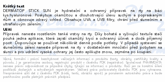 DERMATOP STICK SUN je hydratační a ochranný přípravek na rty na bázi kys.hyaluronové. Poskytuje okamžitou a dlouhotrvající úlevu suchým a popraskaným rtům a obnovuje zdravý vzhled. Obsahuje UVA a UVB filtry, chrání před slunečním a ultrafialovým zářením.