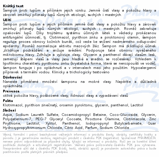 Šampon proti lupům a příčinám jejich vzniku. Jemně čistí vlasy a pokožku hlavy a zároveň zmírňují příznaky lupů různých etiologií, suchých i mastných.