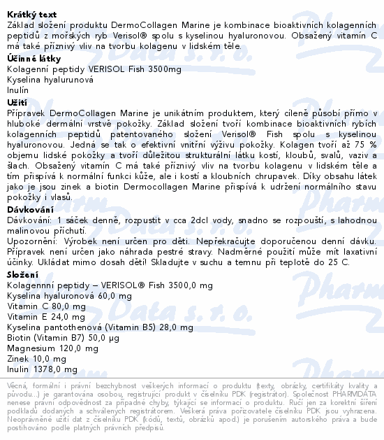 Základ složení produktu DermoCollagen Marine je kombinace bioaktivních kolagenních peptidů z mořských ryb Verisol® spolu s kyselinou hyaluronovou. Obsažený vitamín C má také příznivý vliv na tvorbu kolagenu v lidském těle.