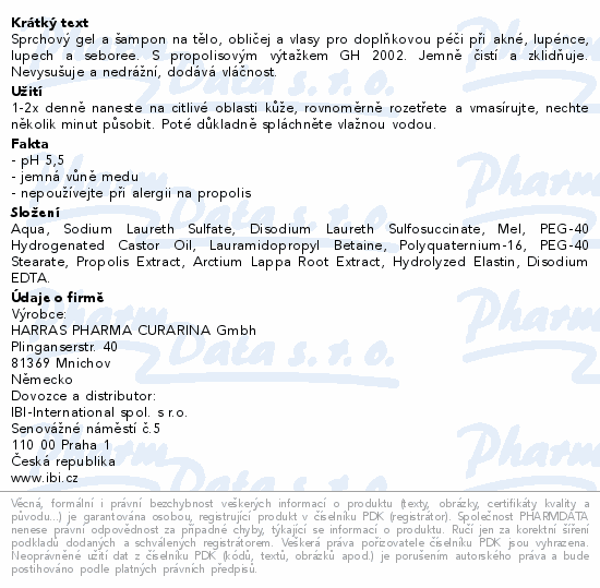 Sprchový gel a šampon na tělo, obličej a vlasy pro doplňkovou péči při akné, lupénce, lupech a seboree. S propolisovým výtažkem GH 2002. Jemně čistí a zklidňuje. Nevysušuje a nedrážní, dodává vláčnost.