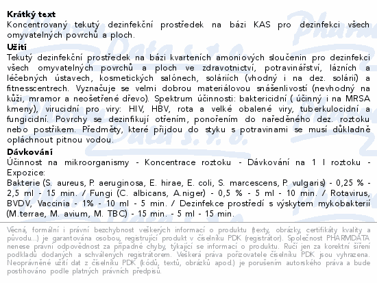 Koncentrovaný tekutý dezinfekční prostředek na bázi KAS pro dezinfekci všech omyvatelných povrchů a ploch.