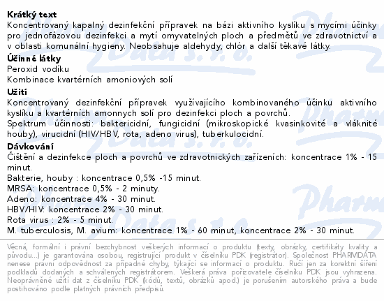 Koncentrovaný kapalný dezinfekční přípravek na bázi aktivního kyslíku s mycími účinky pro jednofázovou dezinfekci a mytí omyvatelných ploch a předmětů ve zdravotnictví a v oblasti komunální hygieny. Neobsahuje aldehydy, chlór a další těkavé látky.
