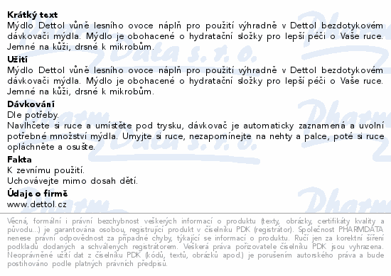 Mýdlo Dettol vůně lesního ovoce náplň pro použití výhradně v Dettol bezdotykovém dávkovači mýdla. Mýdlo je obohacené o hydratační složky pro lepší péči o Vaše ruce. Jemné na kůži, drsné k mikrobům.