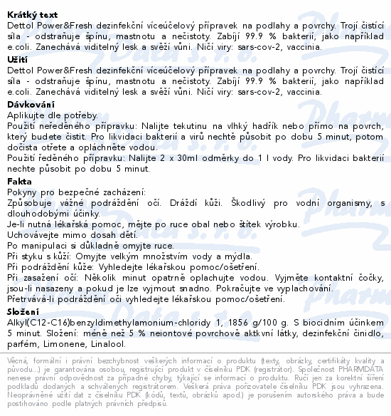 Dettol Power&Fresh dezinfekční víceúčelový přípravek na podlahy a povrchy. Trojí čistící síla - odstraňuje špínu, mastnotu a nečistoty. Zabíjí 99.9 % bakterií, jako například e.coli. Zanechává viditelný lesk a svěží vůni. Ničí viry: sars-cov-2, vaccinia.