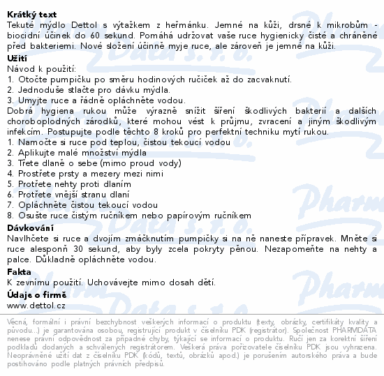 Tekuté mýdlo Dettol s výtažkem z heřmánku. Jemné na kůži, drsné k mikrobům - biocidní účinek do 60 sekund. Pomáhá udržovat vaše ruce hygienicky čisté a chráněné před bakteriemi. Nové složení účinně myje ruce, ale zároveň je jemné na kůži.