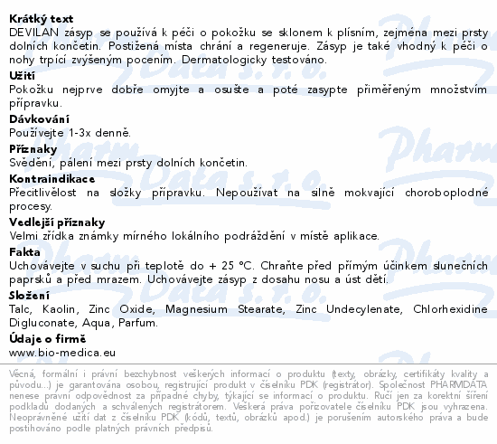 DEVILAN zásyp se používá k péči o pokožku se sklonem k plísním, zejména mezi prsty dolních končetin. Postižená místa chrání a regeneruje. Zásyp je také vhodný k péči o nohy trpící zvýšeným pocením. Dermatologicky testováno.