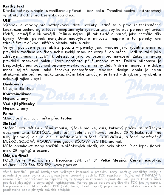 Křehké peřinky s náplní s vanilkovou příchutí - bez lepku. Trvanlivé pečivo - extrudovaný výrobek, vhodný pro bezlepkovou dietu.