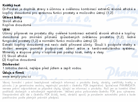 Di-Prostan je doplněk stravy s účinnou a ověřenou kombinací extraktů slivoně africké a kopřivy dvoudomé pro správnou funkci prostaty a močového ústrojí (1,2).