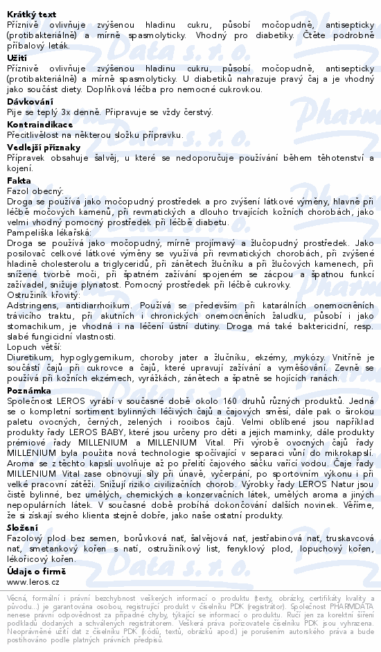 Příznivě ovlivňuje zvýšenou hladinu cukru, působí močopudně, antisepticky (protibakteriálně) a mírně spasmolyticky. Vhodný pro diabetiky. Čtěte pozorně příbalový leták.