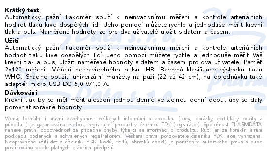 Automatický pažní tlakoměr slouží k neinvazivnímu měření a kontrole arteriálních hodnot tlaku krve dospělých lidí. Jeho pomocí můžete rychle a jednoduše měřit krevní tlak a puls. Naměřené hodnoty lze pro dva uživatelé uložit s datem a časem.