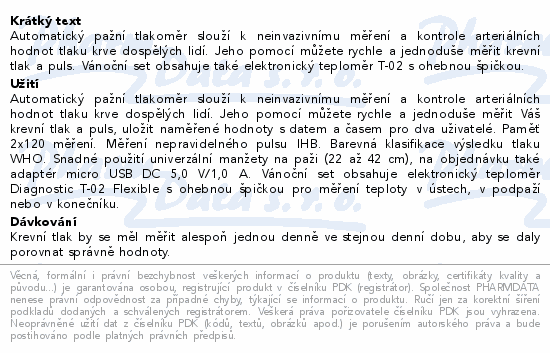 Automatický pažní tlakoměr slouží k neinvazivnímu měření a kontrole arteriálních hodnot tlaku krve dospělých lidí. Jeho pomocí můžete rychle a jednoduše měřit krevní tlak a puls. Vánoční set obsahuje také elektronický teploměr T-02 s ohebnou špičkou.