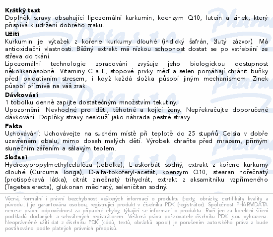 Doplněk stravy obsahující lipozomální kurkumin, koenzym Q10, lutein a zinek, který přispívá k udržení dobrého zraku.