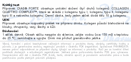 Přípravek DIAS® FORTE obsahuje unikátní složení čtyř druhů kolagenů COLLAGEN QUATTRO COMPLEX™, které se skládá z kolagenu typu I, kolagenu typu II, kolagenu typu III a nativního kolagenu. Denní dávka, tedy jeden sáček dodá tělu 10 g kolagenu.