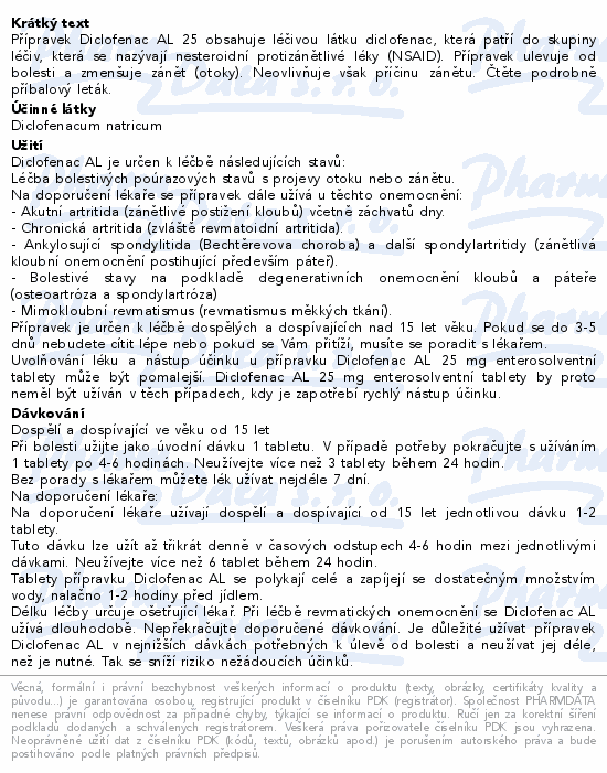 Přípravek Diclofenac AL 25 obsahuje léčivou látku diclofenac, která patří do skupiny léčiv, která se nazývají nesteroidní protizánětlivé léky (NSAID). Přípravek ulevuje od bolesti a zmenšuje zánět (otoky). Neovlivňuje však příčinu zánětu. Čtěte pozorně příbalový leták.