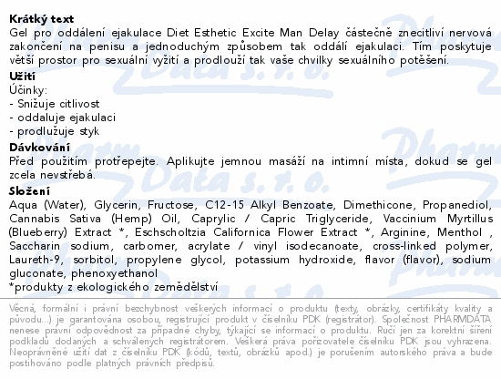 Gel pro oddálení ejakulace Diet Esthetic Excite Man Delay částečně znecitliví nervová zakončení na penisu a jednoduchým způsobem tak oddálí ejakulaci. Tím poskytuje větší prostor pro sexuální vyžití a prodlouží tak vaše chvilky sexuálního potěšení.