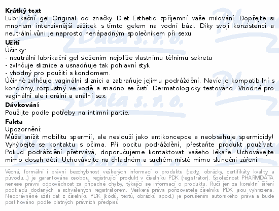 Lubrikační gel Original od značky Diet Esthetic zpříjemní vaše milování. Dopřejte si mnohem intenzivnější zážitek s tímto gelem na vodní bázi. Díky svojí konzistenci a neutrální vůni je naprosto nenápadným společníkem při sexu.