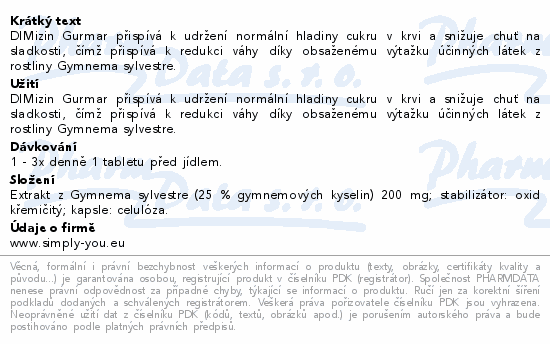 DIMizin Gurmar přispívá k udržení normální hladiny cukru v krvi a snižuje chuť na sladkosti, čímž přispívá k redukci váhy díky obsaženému výtažku účinných látek z rostliny Gymnema sylvestre.
