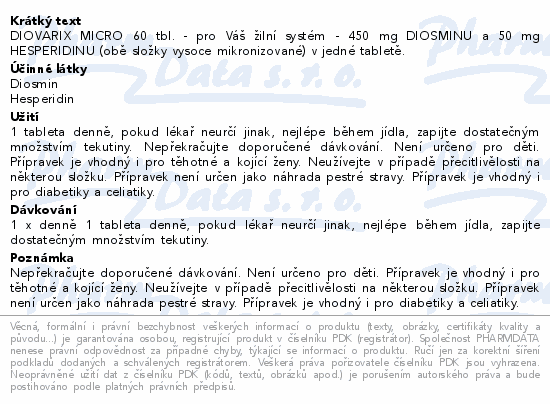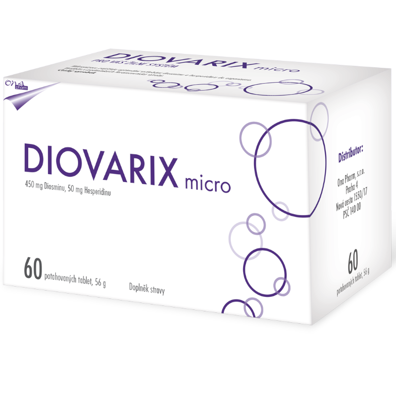 Diovarix micro je doplněk stravy obsahující jedinečnou kombinaci dvou složek: vysoce mikronizovaný diosmin (450 mg) a vysoce mikronizovaný hesperidin (50 mg). Mikronizace účinných látek umožňuje snadnou vstřebatelnost látek.