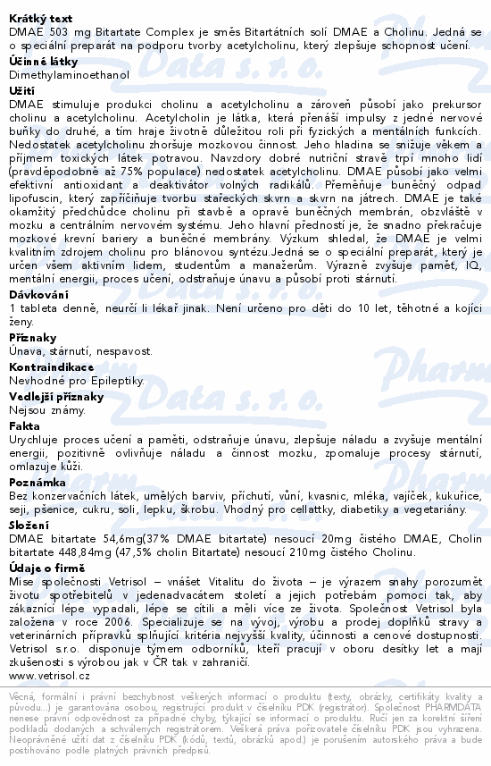 DMAE 503 mg Bitartate Complex je směs Bitartátních solí DMAE a Cholinu. Jedná se o speciální preparát na podporu tvorby acetylcholinu, který zlepšuje schopnost učení.