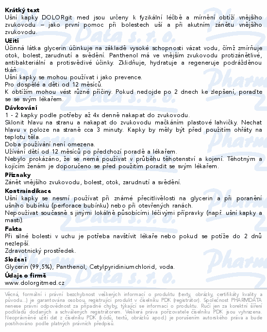 Ušní kapky DOLORgit med jsou určeny k fyzikální léčbě a mírnění obtíží vnějšího zvukovodu – jako první pomoc při bolestech uší a při akutním zánětu vnějšího zvukovodu.