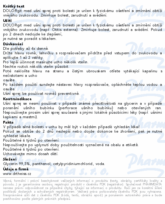 DOLORgit med ušní sprej proti bolesti je určen k fyzickému ošetření a zmírnění obtíží vnějšího zvukovodu. Zmírňuje bolest, zarudnutí a svědění.