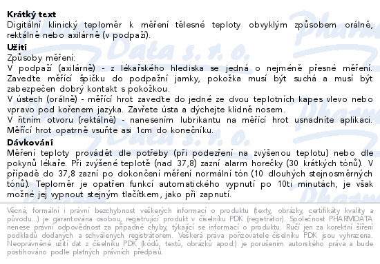 Digitální klinický teploměr k měření tělesné teploty obvyklým způsobem orálně, rektálně nebo axilárně (v podpaží).