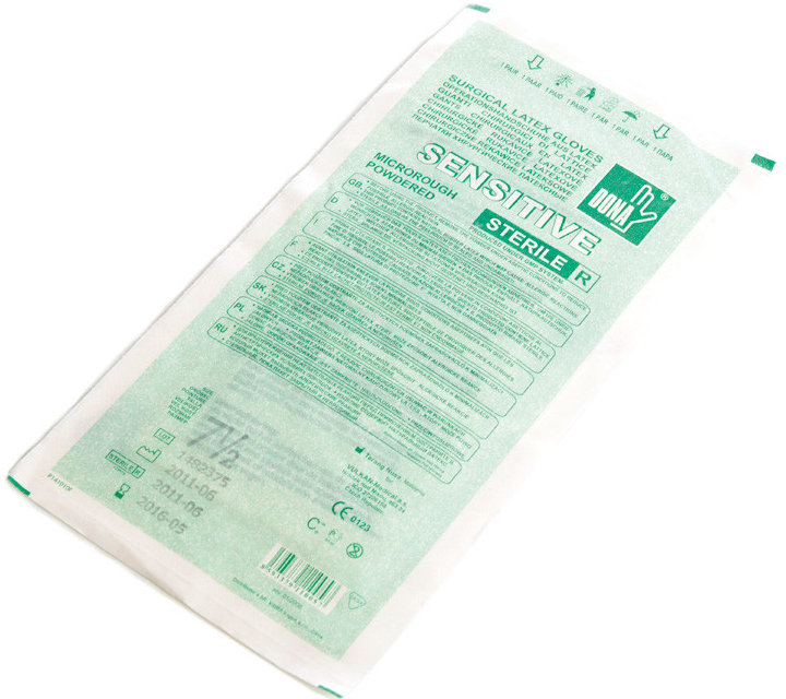 Chirurgické rukavice DONA SENSITIVE microrough, sterilní, AQL 0,65. Certifikovány analýzou FITkit TESTING SERVICES, 100 % elektronickým testováním s nízkým obsahem proteinů, sterilizovány gama zářením.