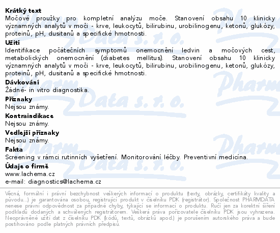 Močové proužky pro kompletní analýzu moče. Stanovení obsahu 10 klinicky významných analytů v moči - krve, leukocytů, bilirubinu, urobilinogenu, ketonů, glukózy, proteinů, pH, dusitanů a specifické hmotnosti.