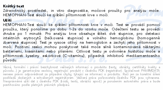 Zdravotnický prostředek, in vitro diagnostika, močové proužky pro analýzu moče. HEMOPHAN-Test slouží ke zjištění přítomnosti krve v moči.