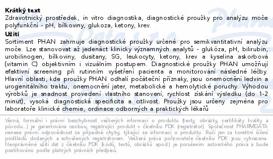 Zdravotnický prostředek, in vitro diagnostika, diagnostické proužky pro analýzu moče polyfunkční - pH, bílkoviny, glukoza, ketony, krev.