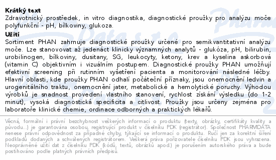 Zdravotnický prostředek, in vitro diagnostika, diagnostické proužky pro analýzu moče polyfunkční - pH, bílkoviny, glukoza.