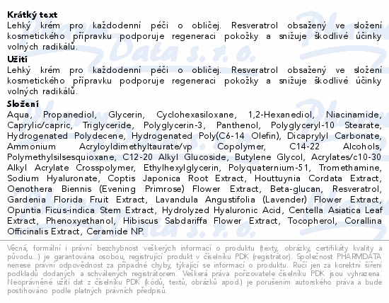 Lehký krém pro každodenní péči o obličej. Resveratrol obsažený ve složení kosmetického přípravku podporuje regeneraci pokožky a snižuje škodlivé účinky volných radikálů.