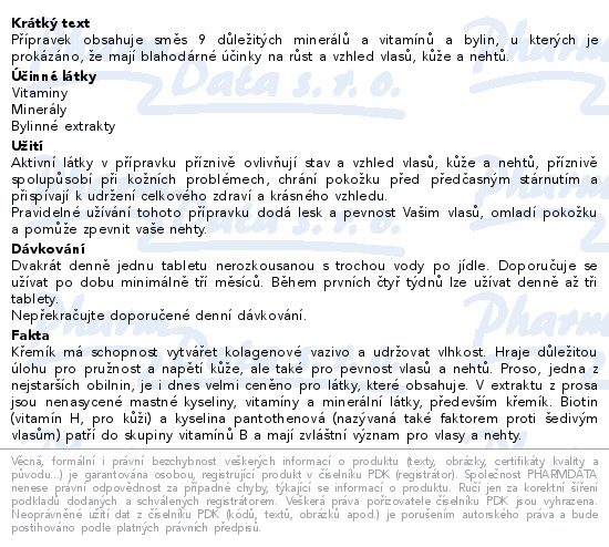 Přípravek obsahuje směs 9 důležitých minerálů a vitamínů a bylin, u kterých je prokázáno, že mají blahodárné účinky na růst a vzhled vlasů, kůže a nehtů.