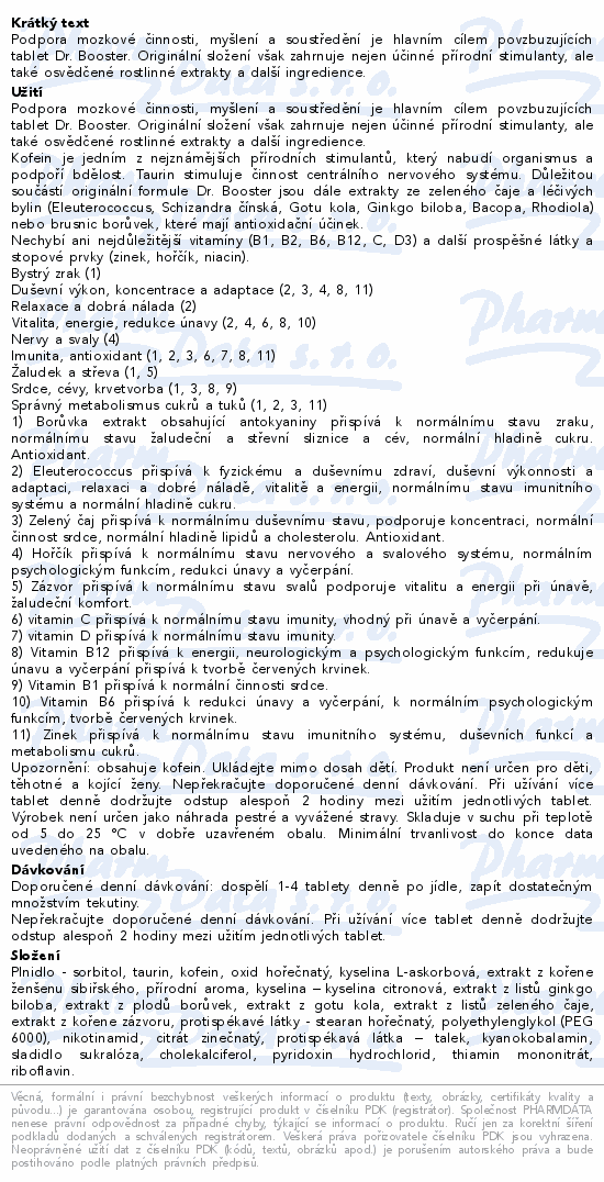 Podpora mozkové činnosti, myšlení a soustředění je hlavním cílem povzbuzujících tablet Dr. Booster. Originální složení však zahrnuje nejen účinné přírodní stimulanty, ale také osvědčené rostlinné extrakty a další ingredience.