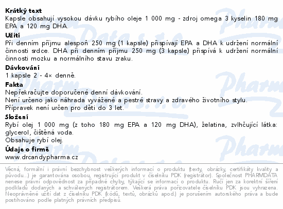 Kapsle obsahují vysokou dávku rybího oleje 1 000 mg - zdroj omega 3 kyselin 180 mg EPA a 120 mg DHA.