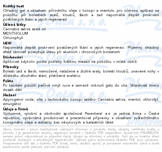 Chladivý gel s obsahem přírodního oleje z konopí a mentolu pro účinnou aplikaci na pokožku při bolestech svalů, kloubů, šlach a zad napomáhá zlepšit prokrvení postižených tkání a jejich regeneraci.