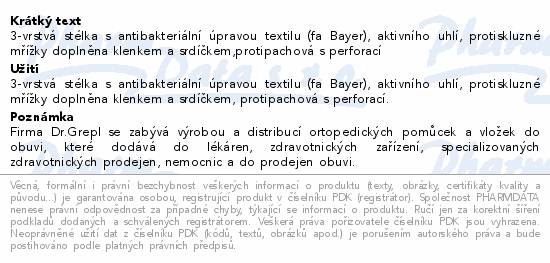 3-vrstvá stélka s antibakteriální úpravou textilu (fa Bayer), aktivního uhlí, protiskluzné mřížky doplněna klenkem a srdíčkem,protipachová s perforací