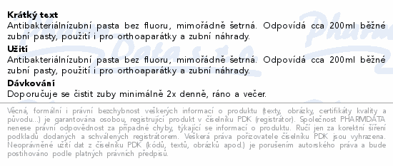 Antibakteriálnízubní pasta bez fluoru, mimořádně šetrná. Odpovídá cca 200ml běžné zubní pasty, použití i pro orthoaparátky a zubní náhrady.