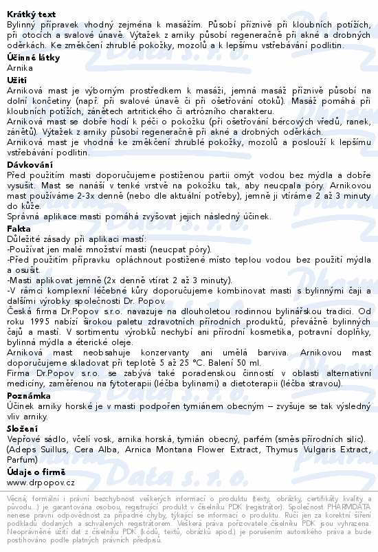 Bylinný přípravek vhodný zejména k masážím. Působí příznivě při kloubních potížích, při otocích a svalové únavě. Výtažek z arniky působí regeneračně při akné a drobných oděrkách. Ke změkčení zhrublé pokožky, mozolů a k lepšímu vstřebávání podlitin.