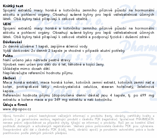 Spojení extraktů macy horské a kotvičníku zemního příznivě působí na hormonální aktivitu a pohlavní orgány. Obsahují sušené byliny pro lepší vstřebatelnost účinných látek. Obě byliny také přispívají k celkové vitalitě.