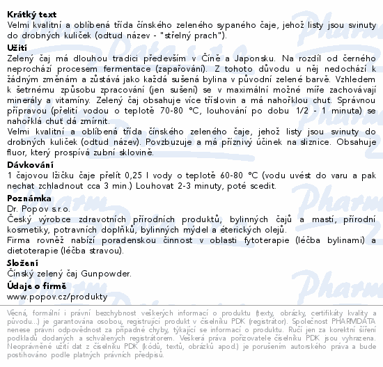 Velmi kvalitní a oblíbená třída čínského zeleného sypaného čaje, jehož listy jsou svinuty do drobných kuliček (odtud název - "střelný prach").
