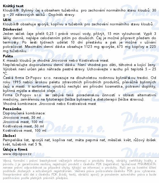 Kloubík®. Bylinný čaj s obsahem tužebníku. pro zachování normálního stavu kloubů. 30 g – 20 nálevových sáčků . Doplněk stravy.