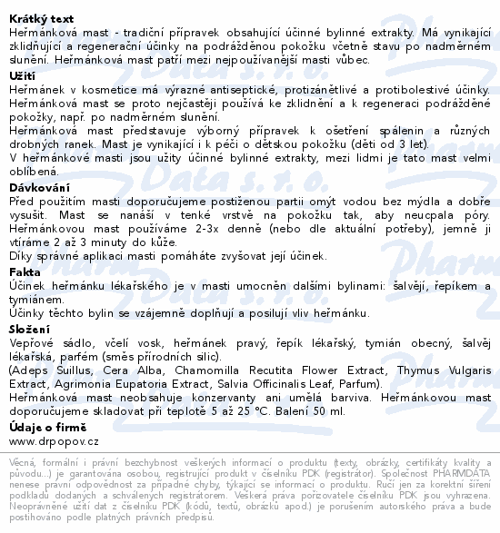 Heřmánková mast - tradiční přípravek obsahující účinné bylinné extrakty. Má vynikající zklidňující a regenerační účinky na podrážděnou pokožku včetně stavu po nadměrném slunění. Heřmánková mast patří mezi nejpoužívanější masti vůbec.