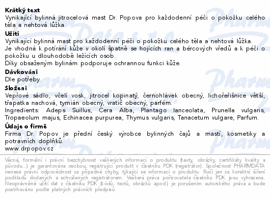 Vynikající bylinná jitrocelová mast Dr. Popova pro každodenní péči o pokožku celého těla a nehtová lůžka.
