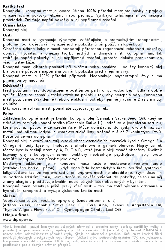 Konopela - konopná mast je vysoce účinná 100% přírodní mast pro osoby s projevy výrazně suché pokožky, ekzému nabo psoriázy. Vynikající zvláčňující a promašťující prostředek. Zmírňuje napětí pokožky a její nepříjemné svědění.