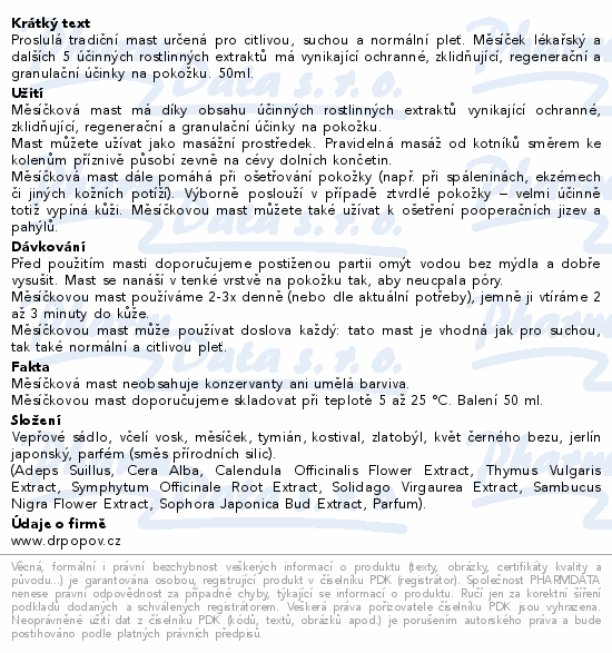 Proslulá tradiční mast určená pro citlivou, suchou a normální pleť. Měsíček lékařský a dalších 5 účinných rostlinných extraktů má vynikající ochranné, zklidňující, regenerační a granulační účinky na pokožku. 50ml.